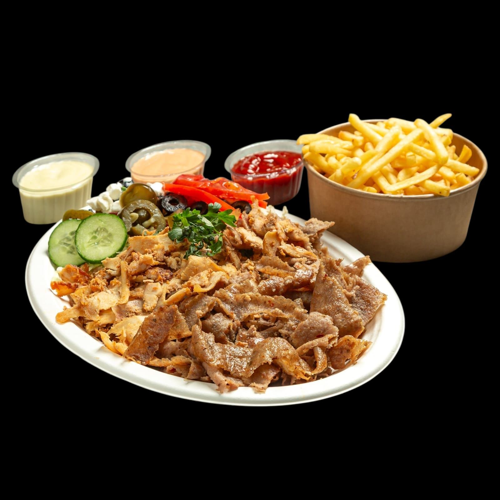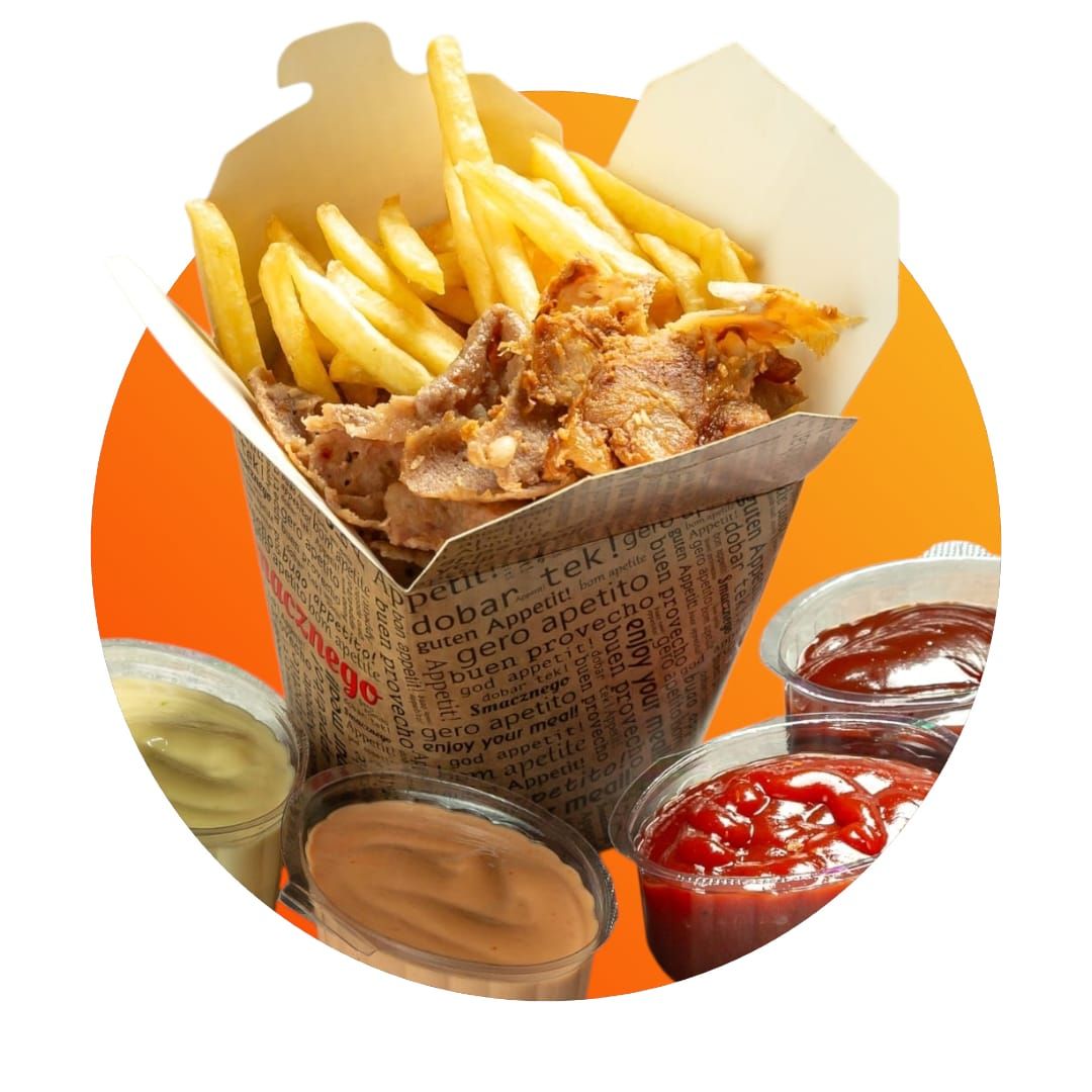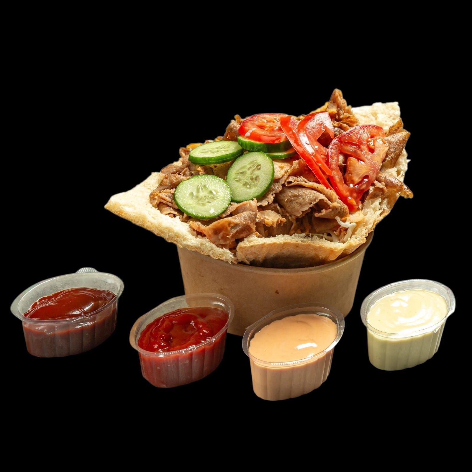 mięso, pomidor, ogórek, feta, oliwki, papryka, sos -