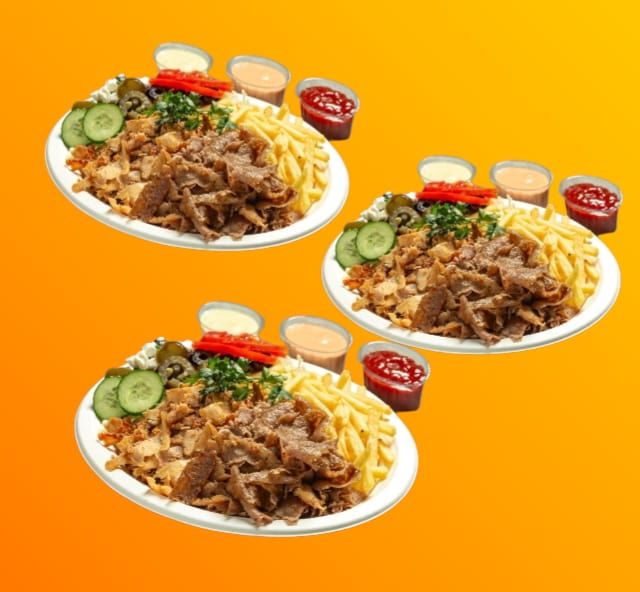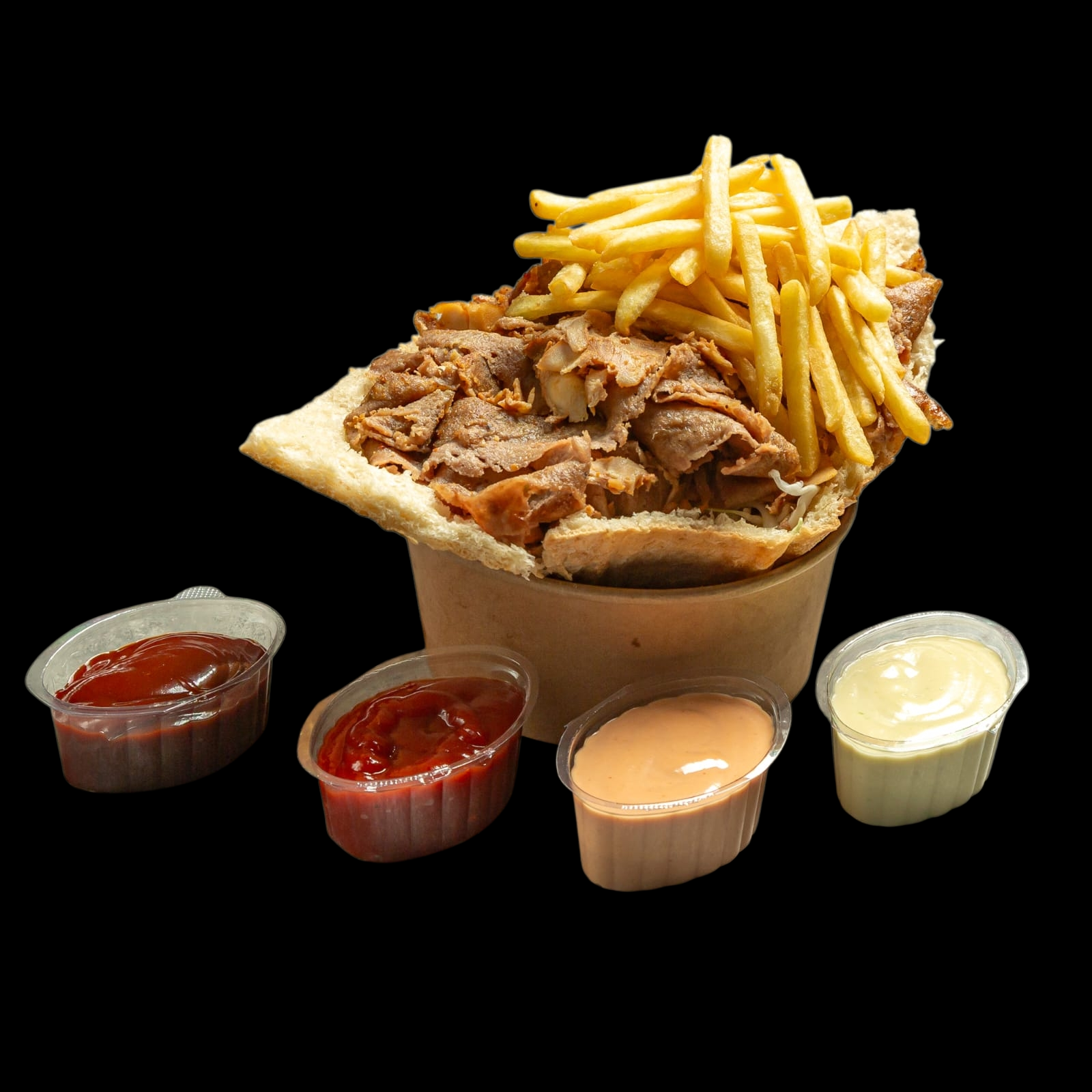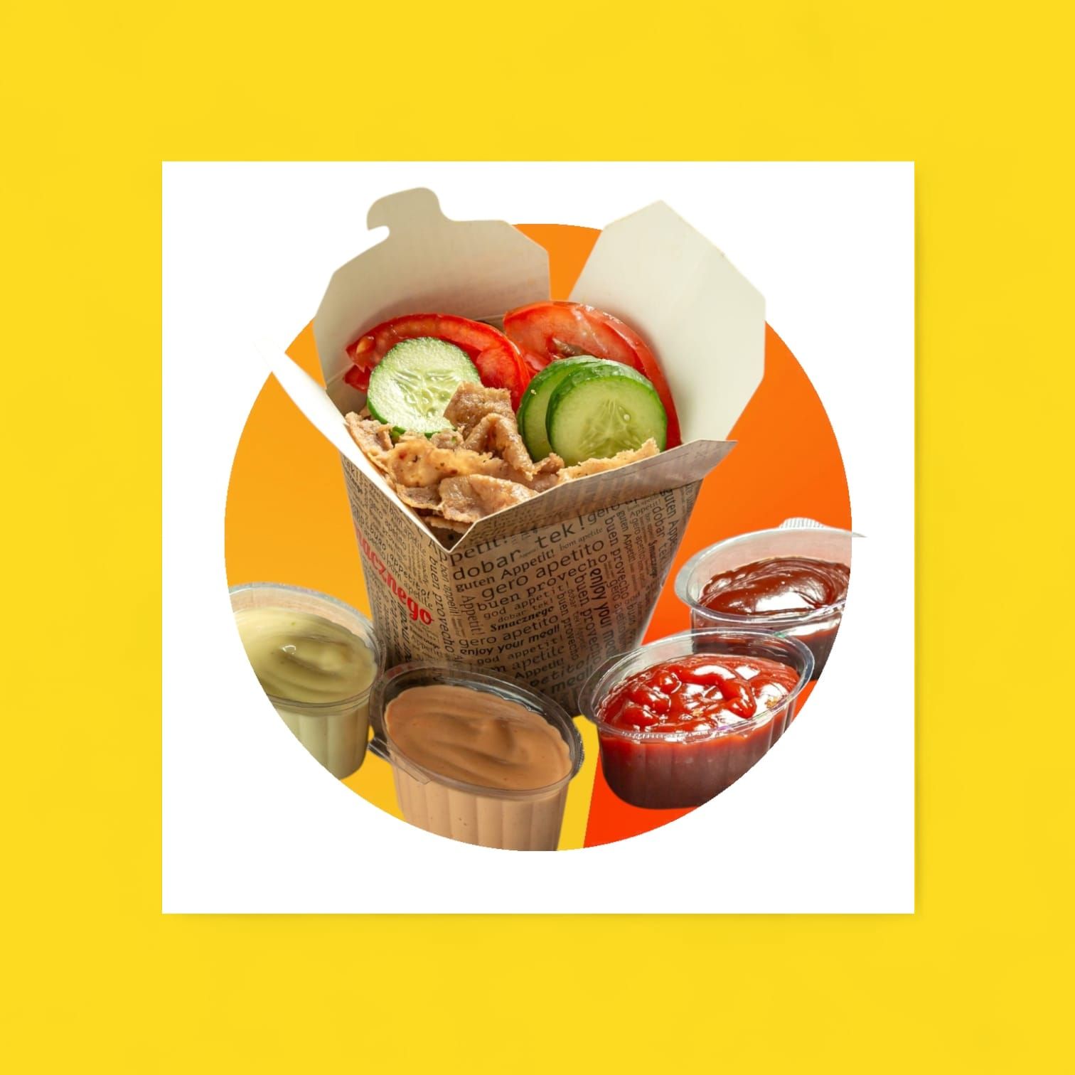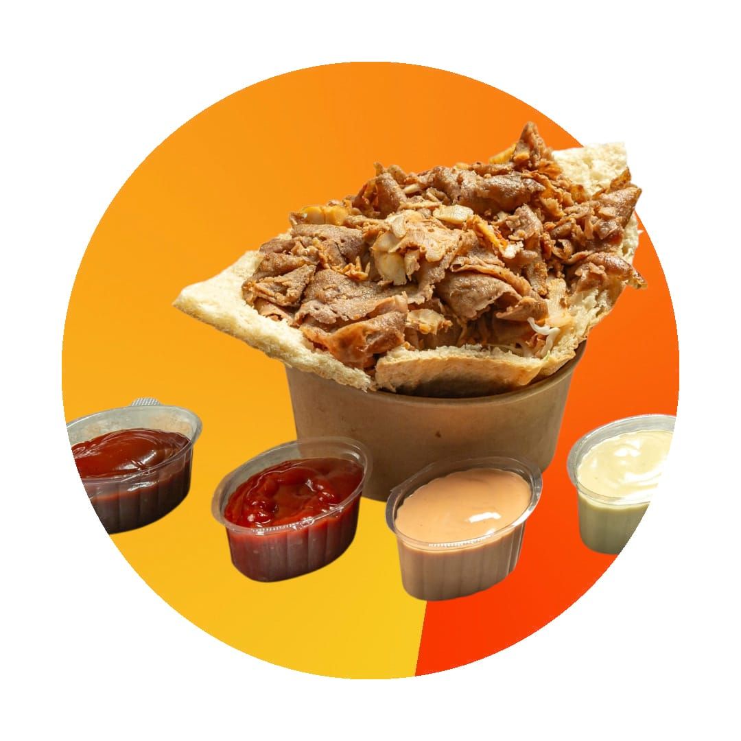 mięso, pomidor, ogórek, feta, oliwki, papryka, sos -
