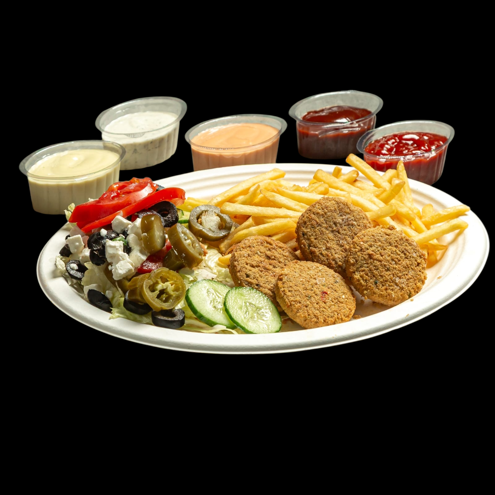 bułka, surówka, pomidor, ogórek, papryka, oliwki, feta, falafel, sos